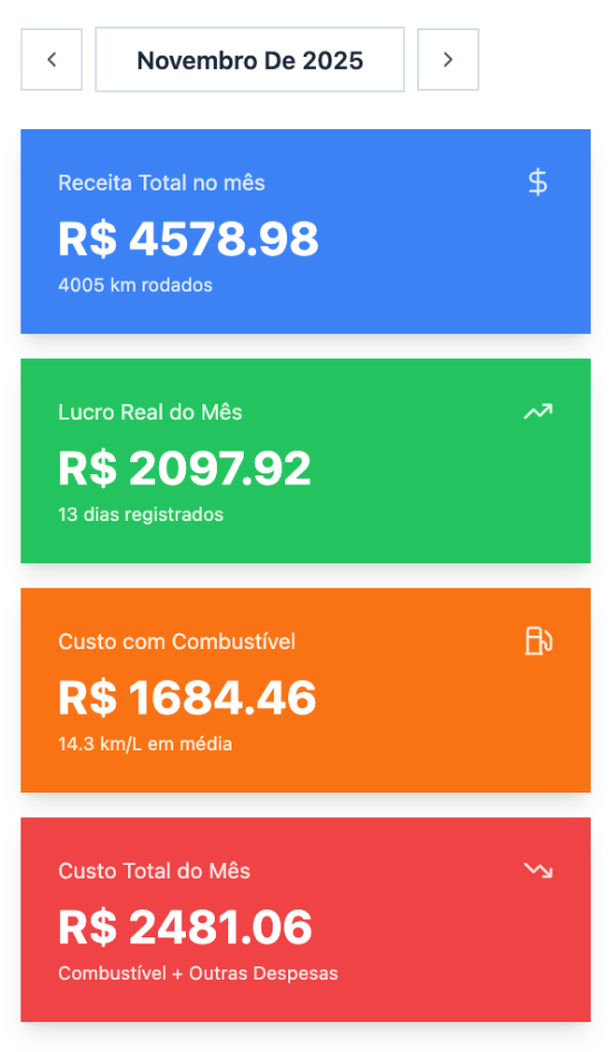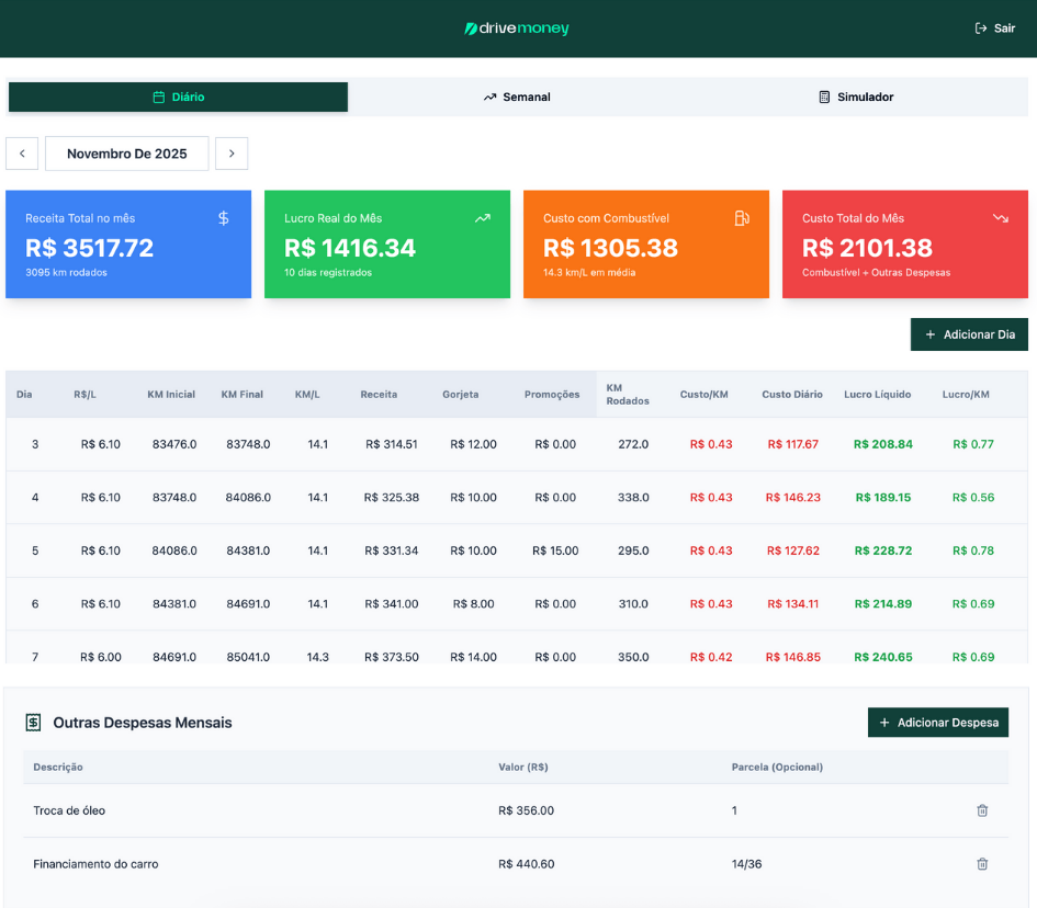 Com o DriveMoney, você terá o controle financeiro diário, semanal e mensal das suas corridas: