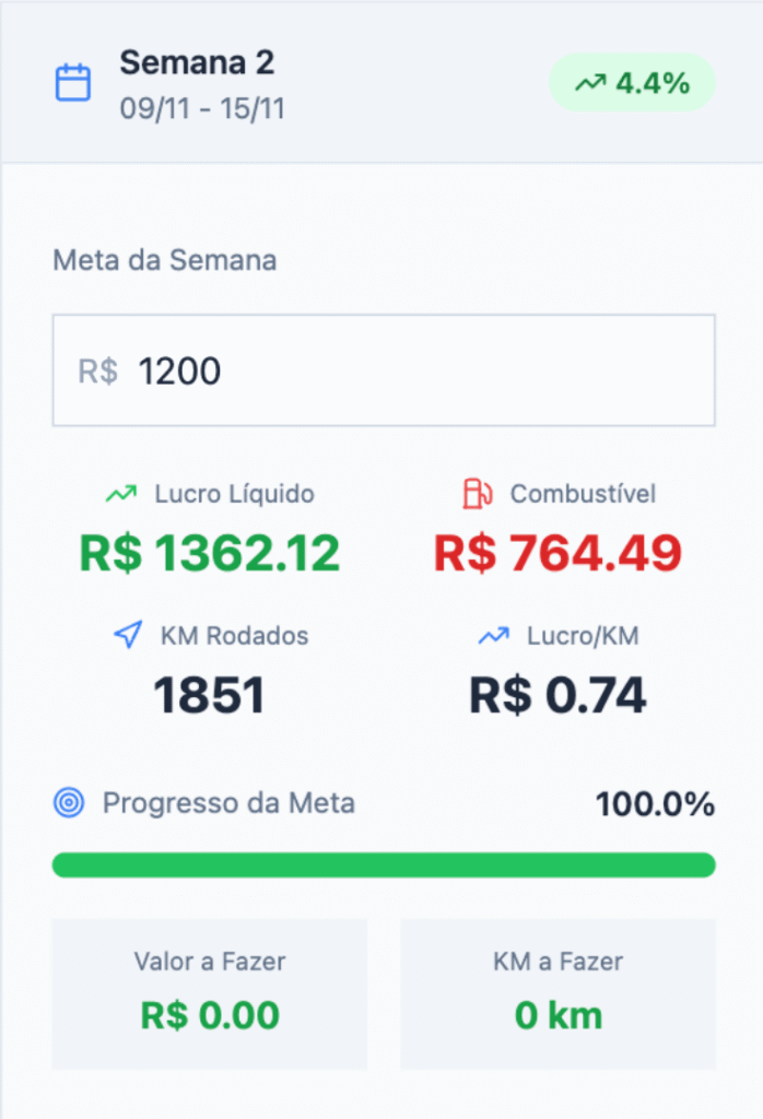 O DriveMoney mostra quanto falta pra bater sua meta — e o quanto precisa rodar amanhã pra chegar lá, aumentando o foco e a disciplina.